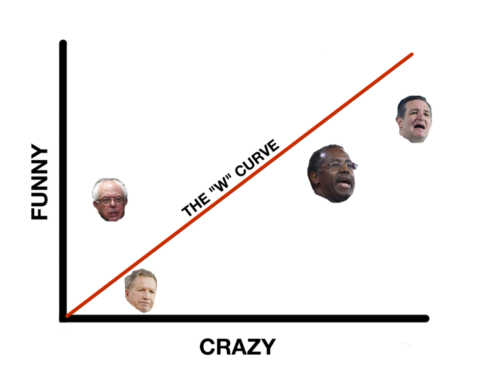 First let's discuss the "W" curve. This curve represents George W. Bush's craziness versus his funniness throughout his presidency. Ideally we would want a candidate that can fall somewhere on this line. Let's get started...
