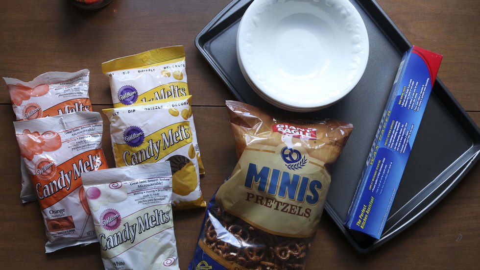 I'm back! With another ridiculously easy candy corn inspired dessert tutorial! Today I made chocolate & pretzel bark. Bark is one of the easiest treats to make, and it is easily customizable. Lots of bark has peanut butter, caramel, fudge, and lots of other stuff added to it. This time I just stuck to the essentials, candy melts, chocolate, and pretzels.