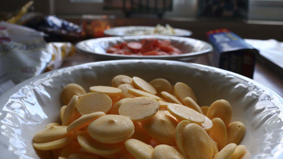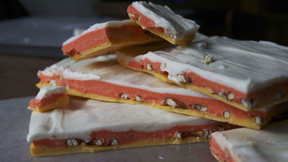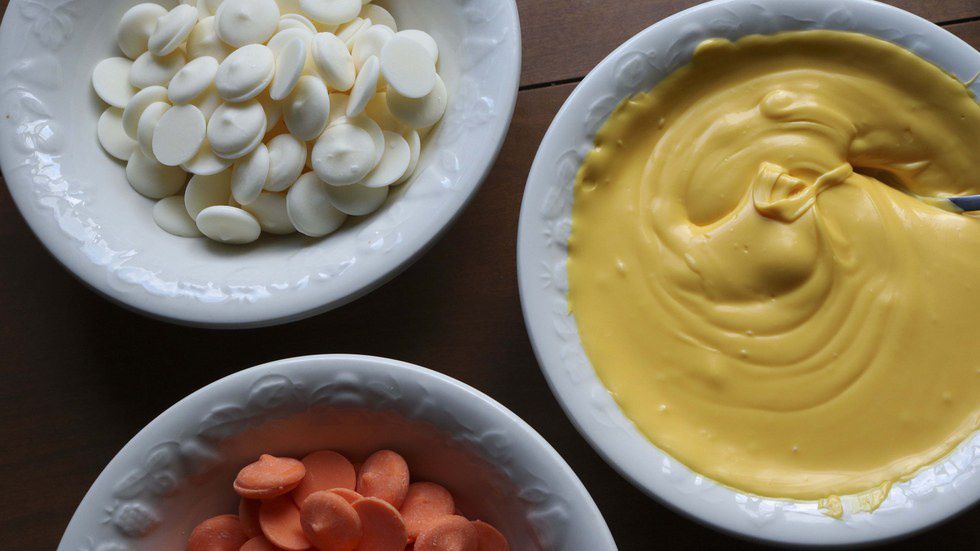 Pictured I have orange, yellow, and white candy melts. Instead of just the white candy melts I ended up adding white chocolate chunks. Feel free to use white chocolate for everything and just dying portions of it yellow and orange with some food coloring. I did use two bags for each layer, but my bark also came out super thick. I would start off with one bag, you can always add more to make the thickness up to your preference.