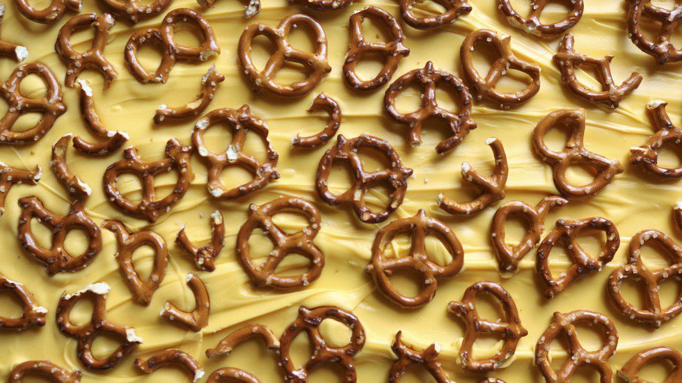 6. Melt the orange and yellow candy melts (or chocolate), and spread them over the pretzels. Orange first, than white.