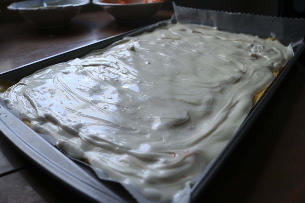 Once the first bowl is melted, just pour it over the wax paper on the cookie sheet. Use a spoon or spatula to smooth it into one even layer.