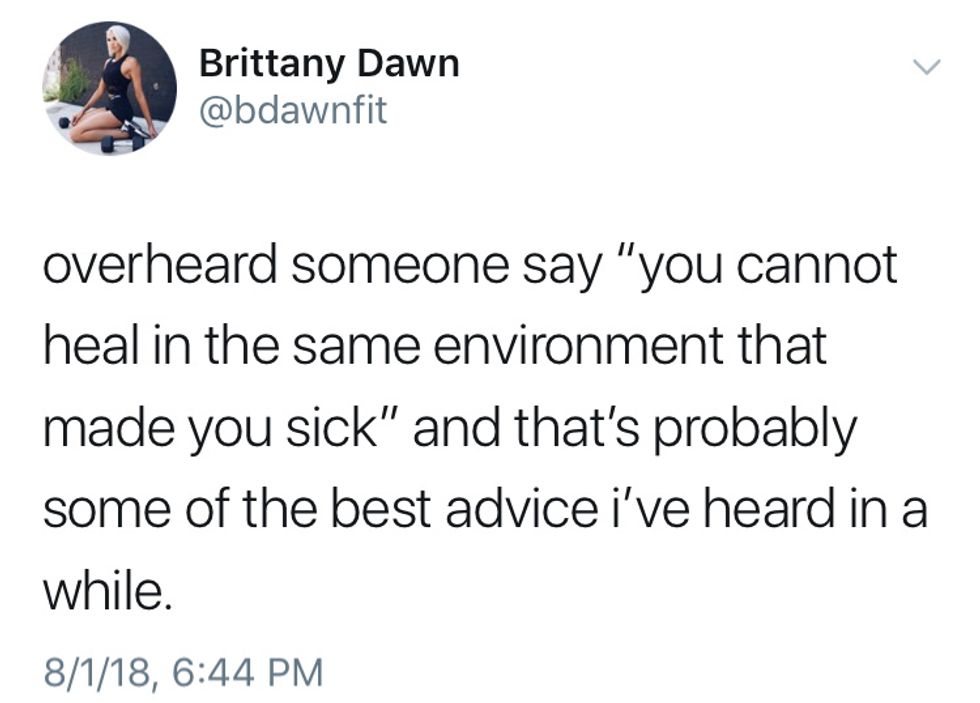 I saw a post on twitter really stood out to me; it that said: "You can't heal in the same environment that made you sick." The concept that in order to grow and heal something needs to change is a concept that I have been following for years, and I couldn't even put it into words a few weeks ago.