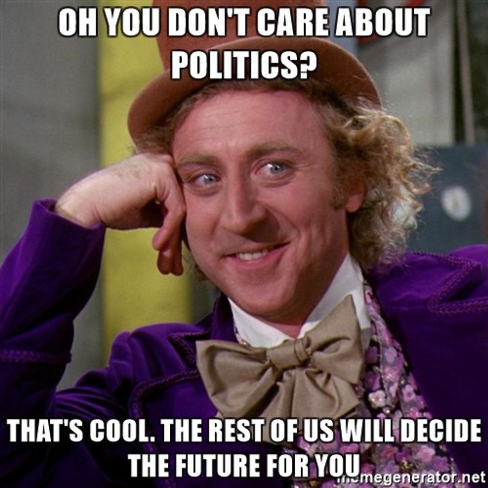 You know how you just said that politics are dumb, and about how you think the government is stupid? Yeah, thank your first Amendment right for that. There are five protections guaranteed in the first amendment to keep the government stepping on your rights; most citizens can’t name all five. That is just the first amendment, there are 26 others in the constitution. If you don’t even know what the amendments and constitution cover, how as a citizen do you expect to protect your rights? If you don’t care about politics, you don’t care about your rights as a citizen.