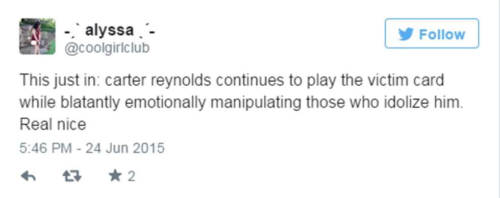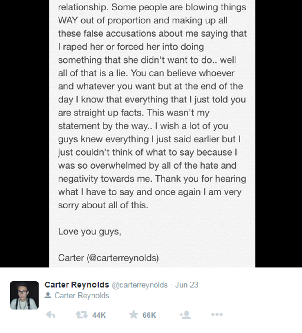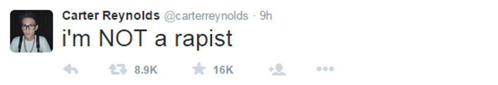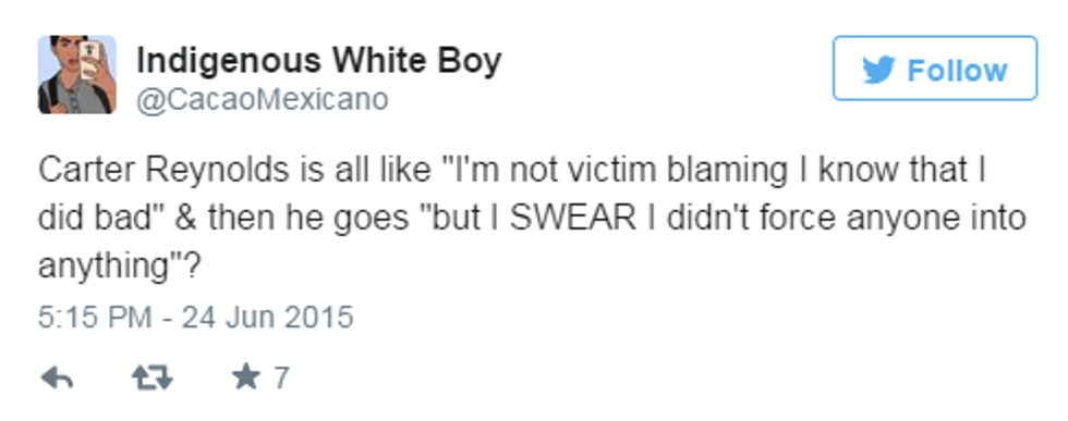 Carter Reynolds is an in-your-face example of why rape culture is so readily accepted. It's terrible the amount of excuses and victim blaming he shows in just one of his posts. But this is not okay. Not now, and not ever.