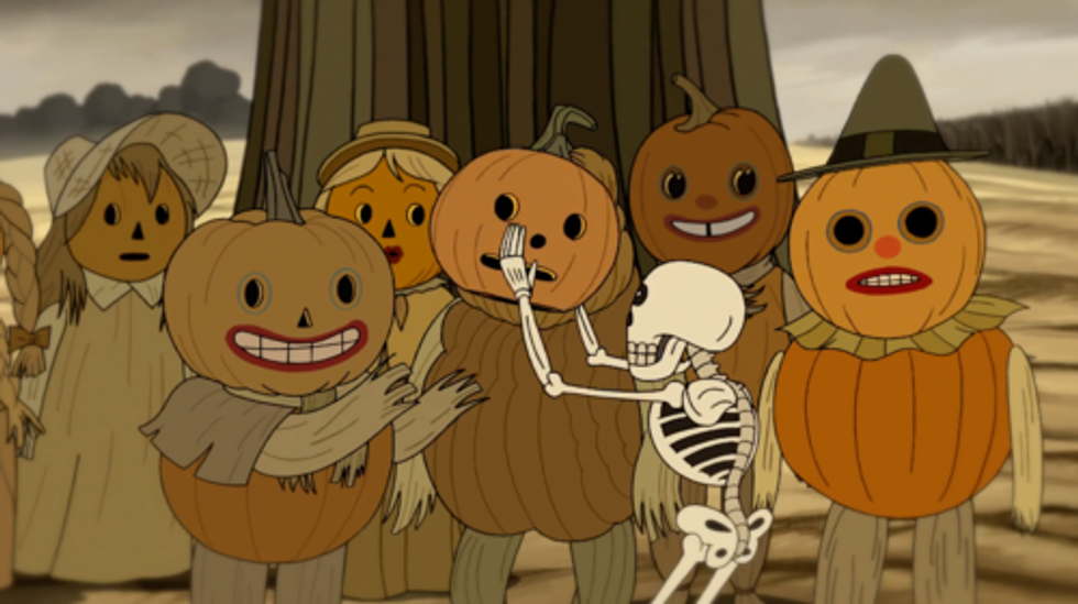 In the episode, "Hard Times at the Huskin' Bee," Wirt, Greg, and Beatrice meet the people from the town Pottsfield, who dress up for a husking bee (a real New England tradition), which celebrates the harvest. The name Pottsfield is a reference to a potter's field, a place where poor or unknown people would be buried. The townspeople dressed up in various crops from the harvest, using pumpkins for heads. At the end of the episode, Wirt finds out the costumes hid not people, but animated skeletons. This ending was ominously inferred when a townsperson said that Wirt was "a little early" to be there, meaning that he wasn't dead yet. But the leader of Pottsfield, Enoch, assured Wirt that he would join them someday.