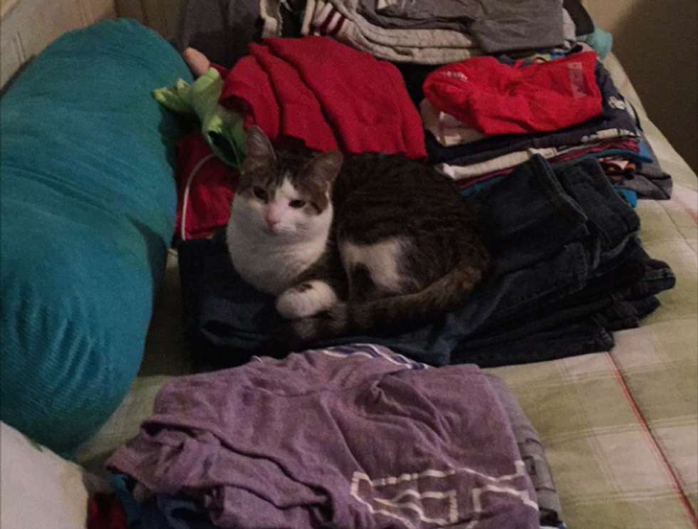 Sleeping on mom's clothes. OK, I'll admit, I let you get away with this a lot because I like to think you feel most comfortable when you're around my scent (and I think it's super cute, of course). On the other hand, you shed. Quite a bit. On my clean laundry. This includes the black dress clothes you claimed as your pillow the night before a job interview. Thank you for that. Also, you've taken to stealing my socks and carrying them around the house like prey. At first, I tolerated it and deemed it cute, as usual. Then you graduated to dragging mom's underwear around the house. Not so cute.