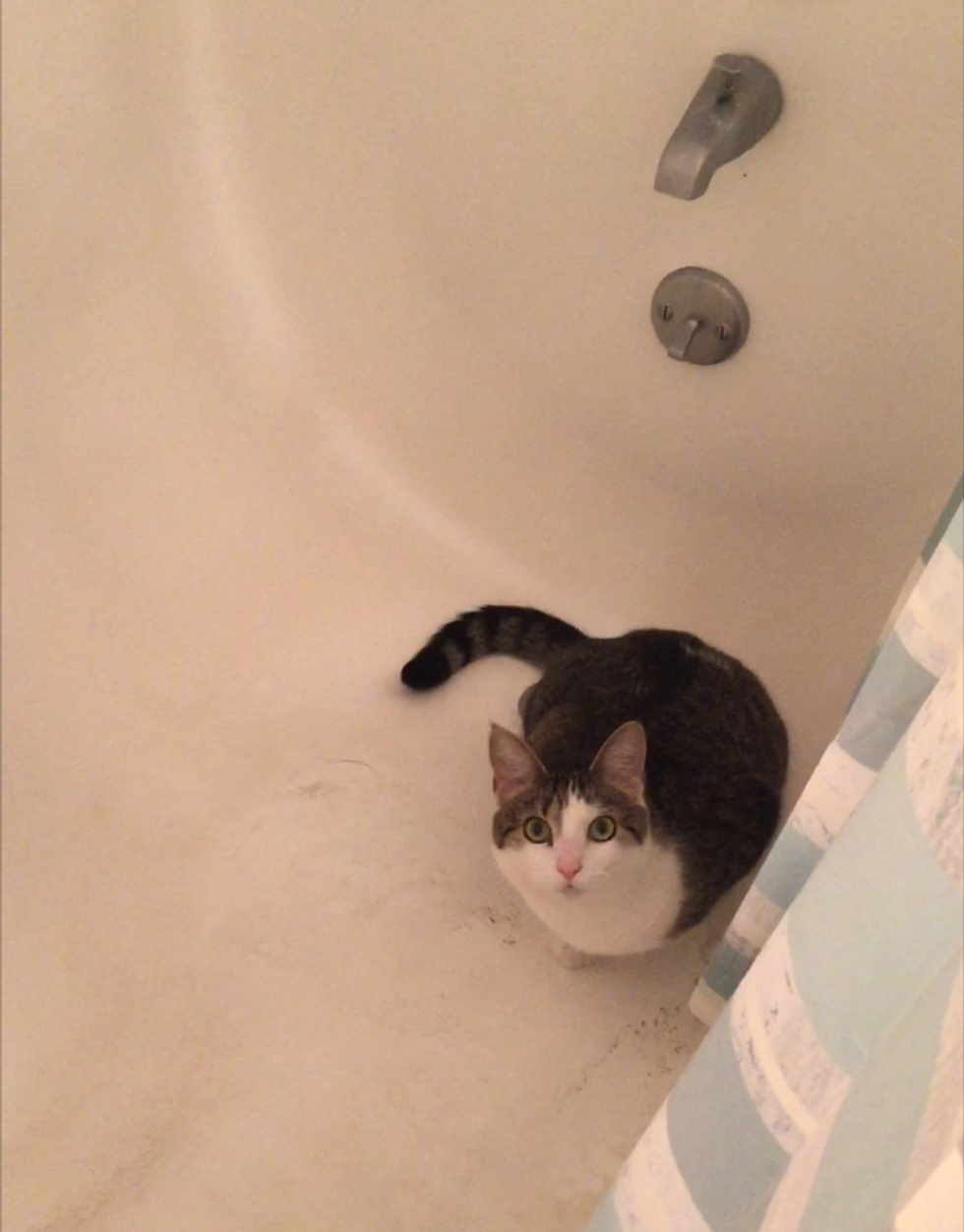 Again, mom has to take a shower! Always remember the time I turned the faucet on while you were in there. Never forget—I know water is your weakness! Though, sometimes it's cute when you putz around in the tub. But it wasn't cute when you knocked over a conditioner bottle with your tail, panicked, got stuck in the curtain, jumped in my lap, and dug your claws into my thigh while I was going to the bathroom. I guess I'll never forget that.