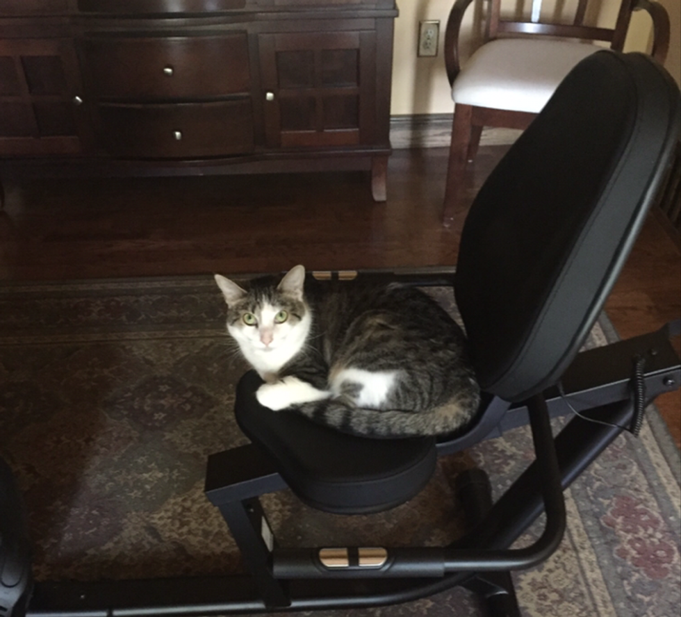 You have this habit of claiming things that are not yours. Grandma's exercise bike? No. Kitchen table? No. Kitchen counter? No. And for the love of god, stop digging your claws into my computer chair. You've nearly destroyed what once was a beautiful chair. And for that I can't forgive you. Sorry.