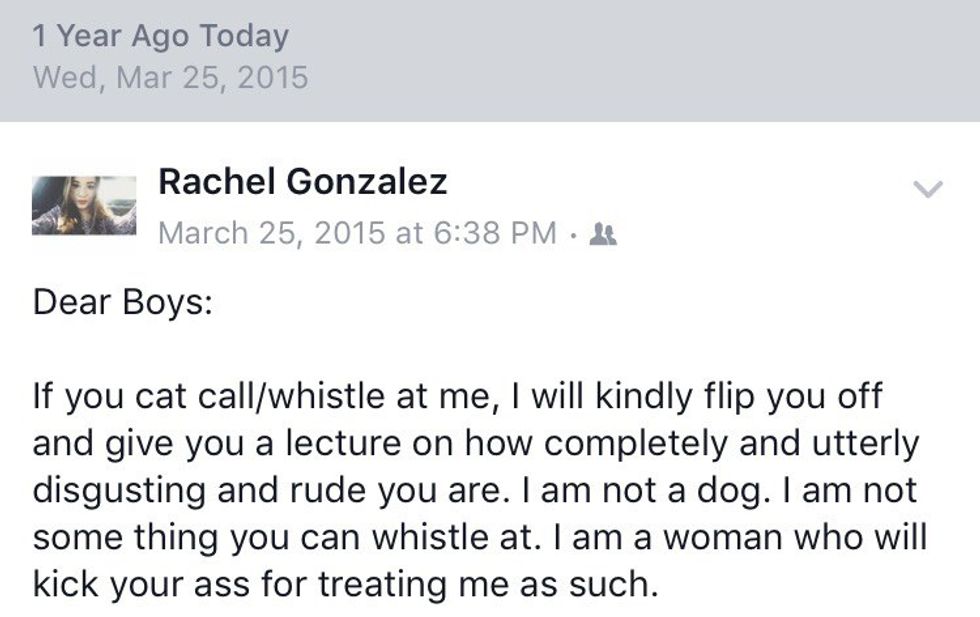 Whether or not you are a man who has engaged in such behavior, or you are a woman who has experienced catcalling first hand, it is important that more people talk about this sort of thing. Every Sunday when my old roommate and I would walk to Dunkin' Donuts to get a coffee and a breakfast sandwich, we would count the amount of times we were honked at. One day, we were honked at six times on our way to Dunkin', and four times on the way back. And when I was 17 years old, I made the following Facebook post: