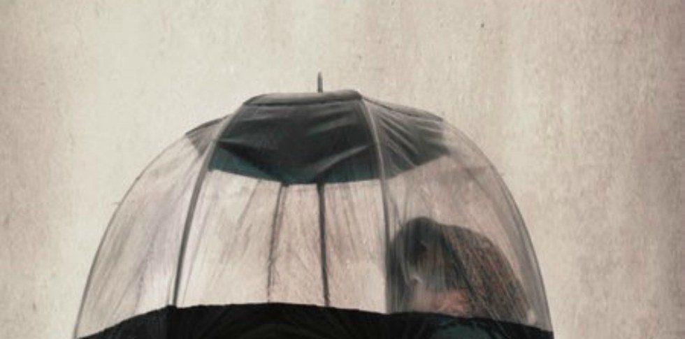 Above, the sky rages with tears as the rain comes down harder and faster until the girl's umbrella is filled to the last centimeter