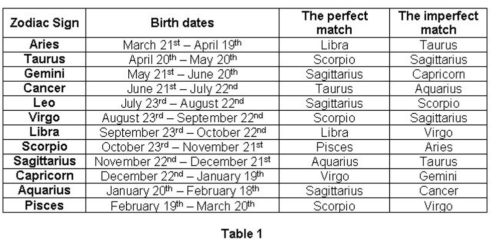 Some may use zodiac signs as an indication of how likely a relationship will work out or last based on compatibility charts such as this one.