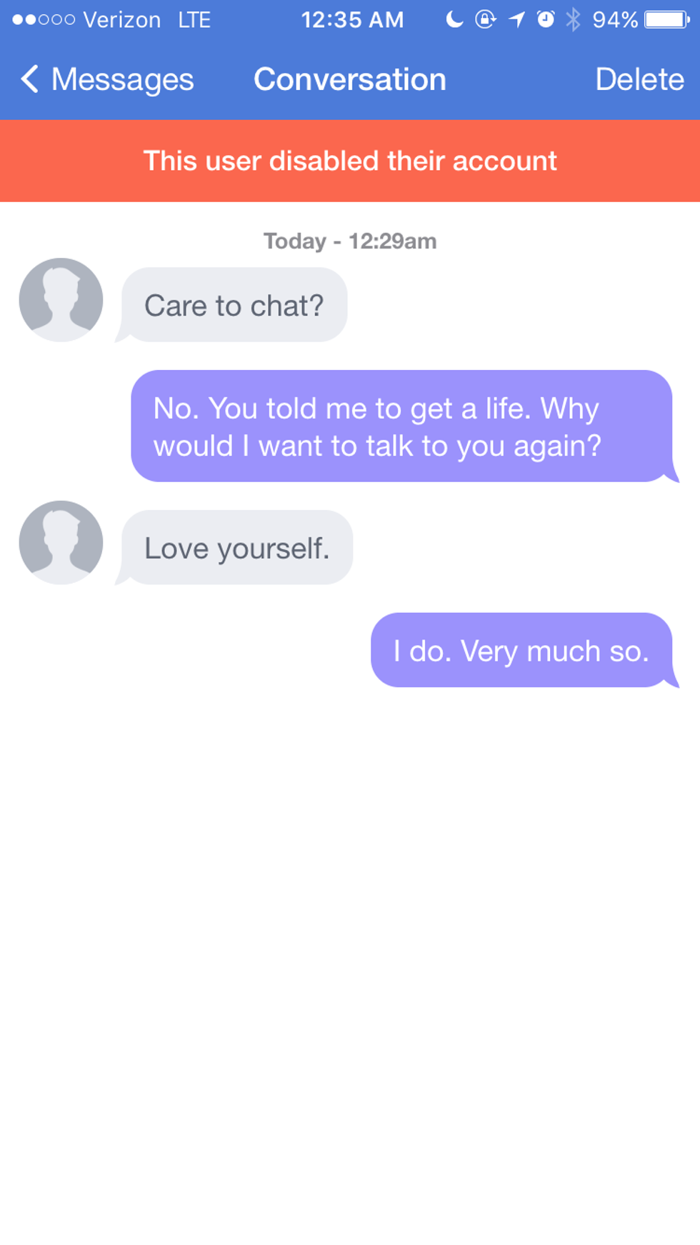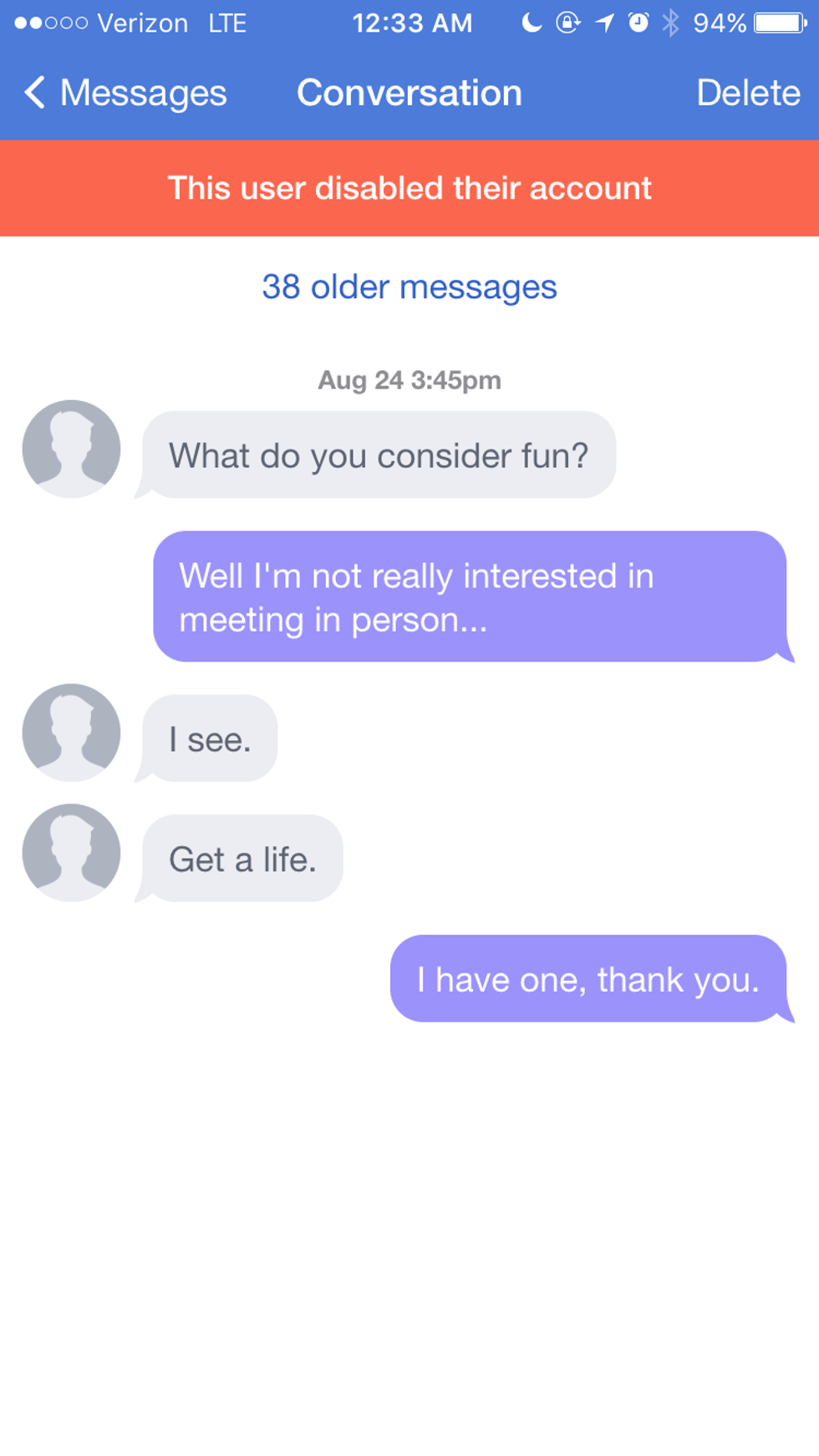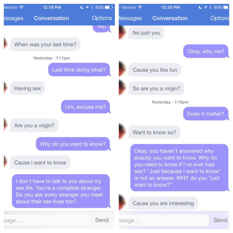 In a part of the conversation that is not pictured, I ask him why it mattered to him whether or not male genitalia has ever been near me, and he never responded, so... Let me also just add that, once again, I did not get offended. Just really, really confused and creeped out.