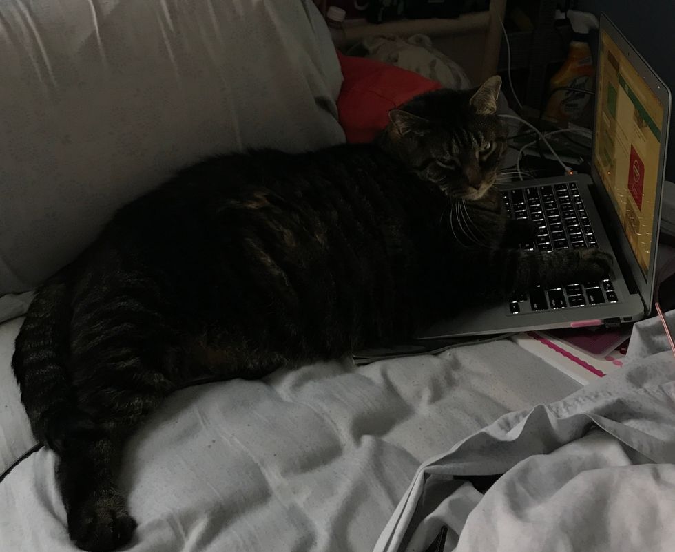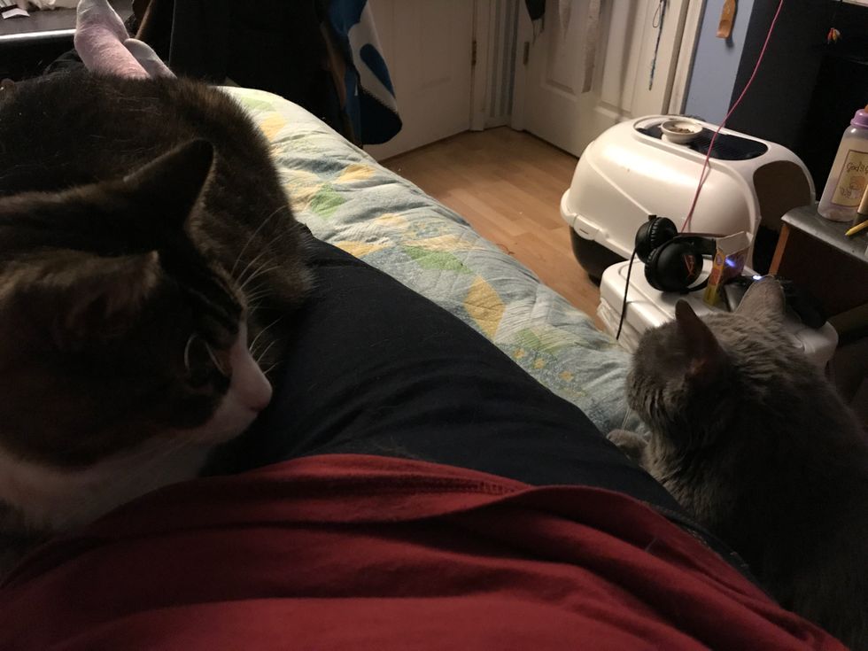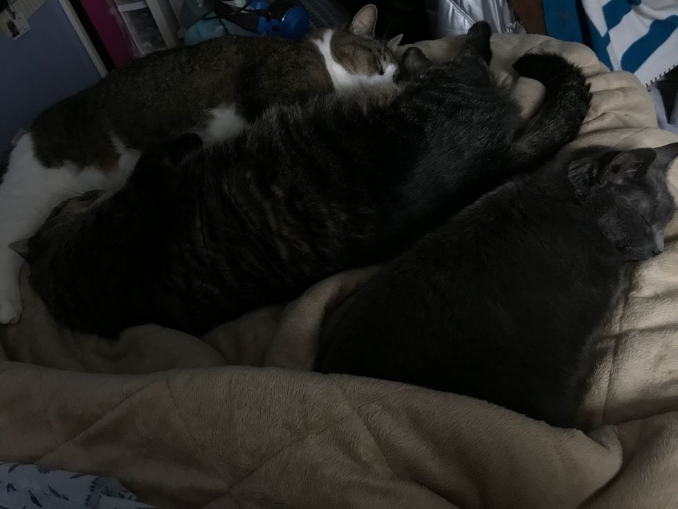I can have as much as four cats on my bed at one time. Mind you, I only have a twin bed, and I am not that skinny. So trying to sleep in my bed can sometimes be quite a challenge. I often have to adjust my body around at least one cat as to disturb them as little as possible. Another case of what is mine is now theirs.