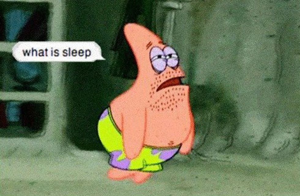 Please make sure you get enough sleep during Finals Week. In order to retain all of that information and knowledge you have read over and over in your mind, you need to sleep. If anything, you can wake up early the next day and continue to study, but don't pull all-nighters and please don't be like Patrick.