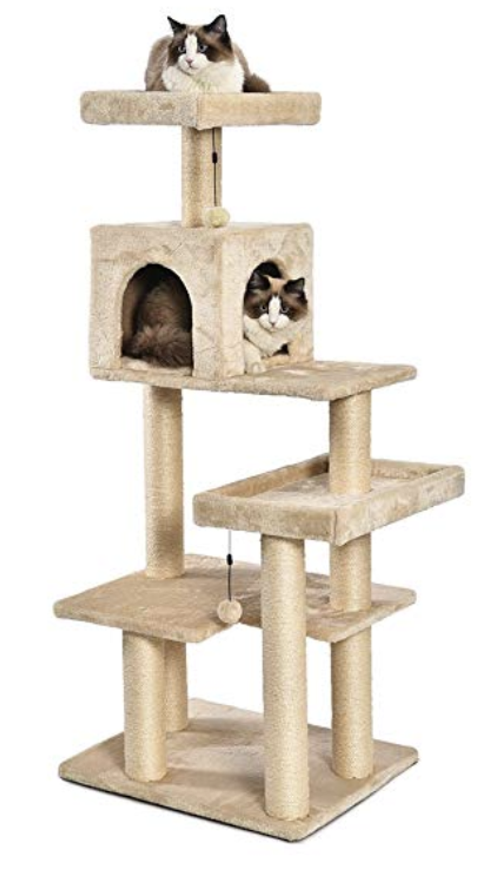 "Give your kitty the purrrrrfect playground with the AmazonBasics Cat Furniture. This deluxe, scratch-friendly environment allows your pet to relax or entertain themselves for hours on end, keeping their claws busy and their mind content. Place near your cat's favorite window or anywhere he or she likes to spend time, and watch the fun begin. The cat tree is a great deterrent for cats with a proclivity for scratching things they shouldn't, such as drapes, blinds, furniture, and more."