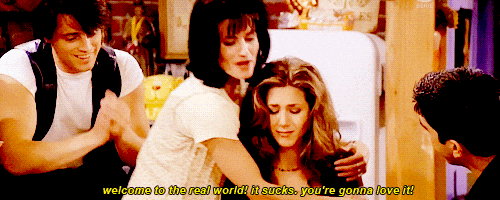 The very first episode. Monica tells Rachel "welcome to the real world! it sucks. you're going to love it!', trying to comfort her friend. But it is the truth. The real world does suck. We have all these responsibilities: school, work, bills, tuition, etc. But being in the real world you learn more and more about yourself and get to have amazing experiences. So even with the pain of responsibility you get to enjoy yourself and love the real world.