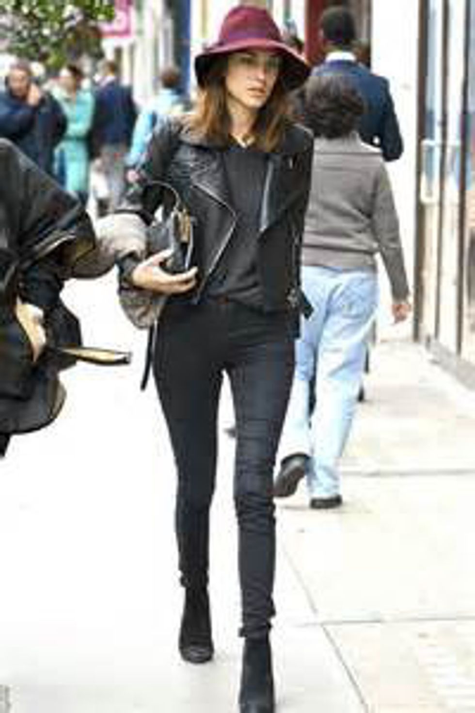 Chung's maroon floppy hat adds color and spice to the all black ensemble. She always looks rocker with this classic black leather jacket on the streets.