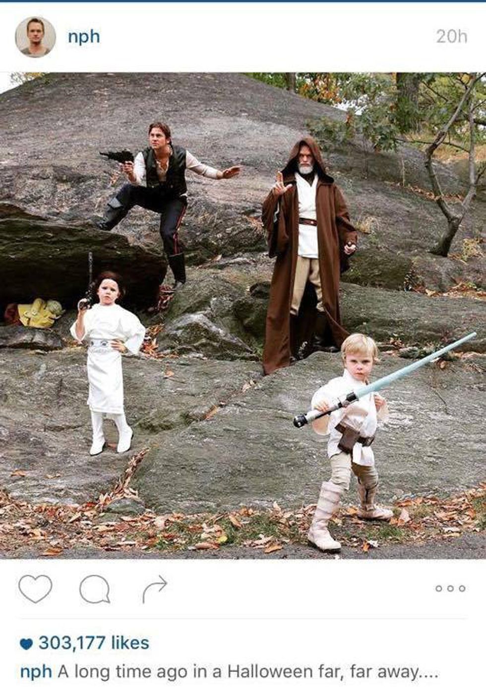 #familygoals. Neil Harris and his family dressed up as characters from "Star Wars." Can this be any cuter? The "How I Met Your Mother" star paired up as the Jedi master Obi-Wan Kenobi with his husband as Han Solo. The kiddos doubled as Princess Leia and Luke Skywalker. Similar to Klum, the Harris family goes hard for halloween. In the past they have been Batman characters , https://instagram.com/p/fslN4ayTgY/Alice in Wonderland, and Neverland characters. Again, family goals.