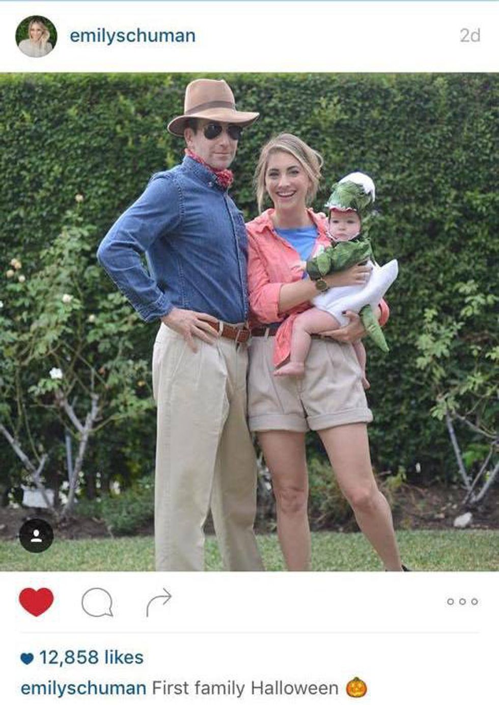 Family goals continued. Yes, that heart <3 is me personally liking this photo. Cupcakes and Cashmere blogger Emily Schuman celebrated her daughter Sloan's first Halloween. What better way to celebrate than dressing up as characters from the 2015 hit "Jurassic Park?" She isn't the only mom to use the ever growing popular Pottery Barn Kids costumes.