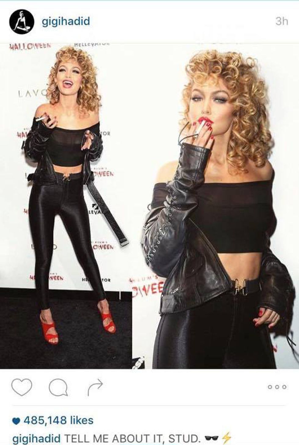 "Tell me about it, Stud." Gigi Sandy. When people are able to go as their doppelgänger, I am a happy fan -- and no, I am not giving Kim K credit for going as herself. Gigi's blonde hair and slender frame almost doubles as a 2015 Sandy. With just a few simple accessories, Gigi killed it in her "Grease" costume. All she really needed was a Danny.