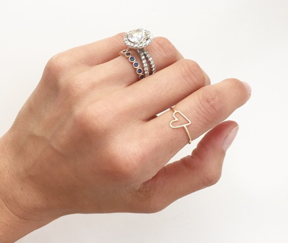 By Lorraine Schwartz, features a large heart-shaped diamond. The band features pave diamonds set in a white metal, most likely platinum, and a unique personalization of "T ♡ S " at the bottom of the band.