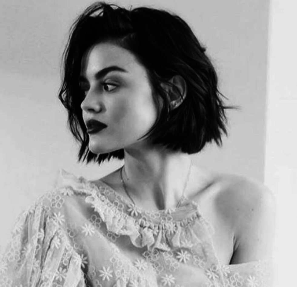 Short hair is so cute. I always wish I could rock it but my hair puffs out like no one's business. The sleek black short bob is definitely one that many people can rock. Lucy Hale is so pretty bottom line. If you want to tackle cutting your hair yourself I have attached this video.