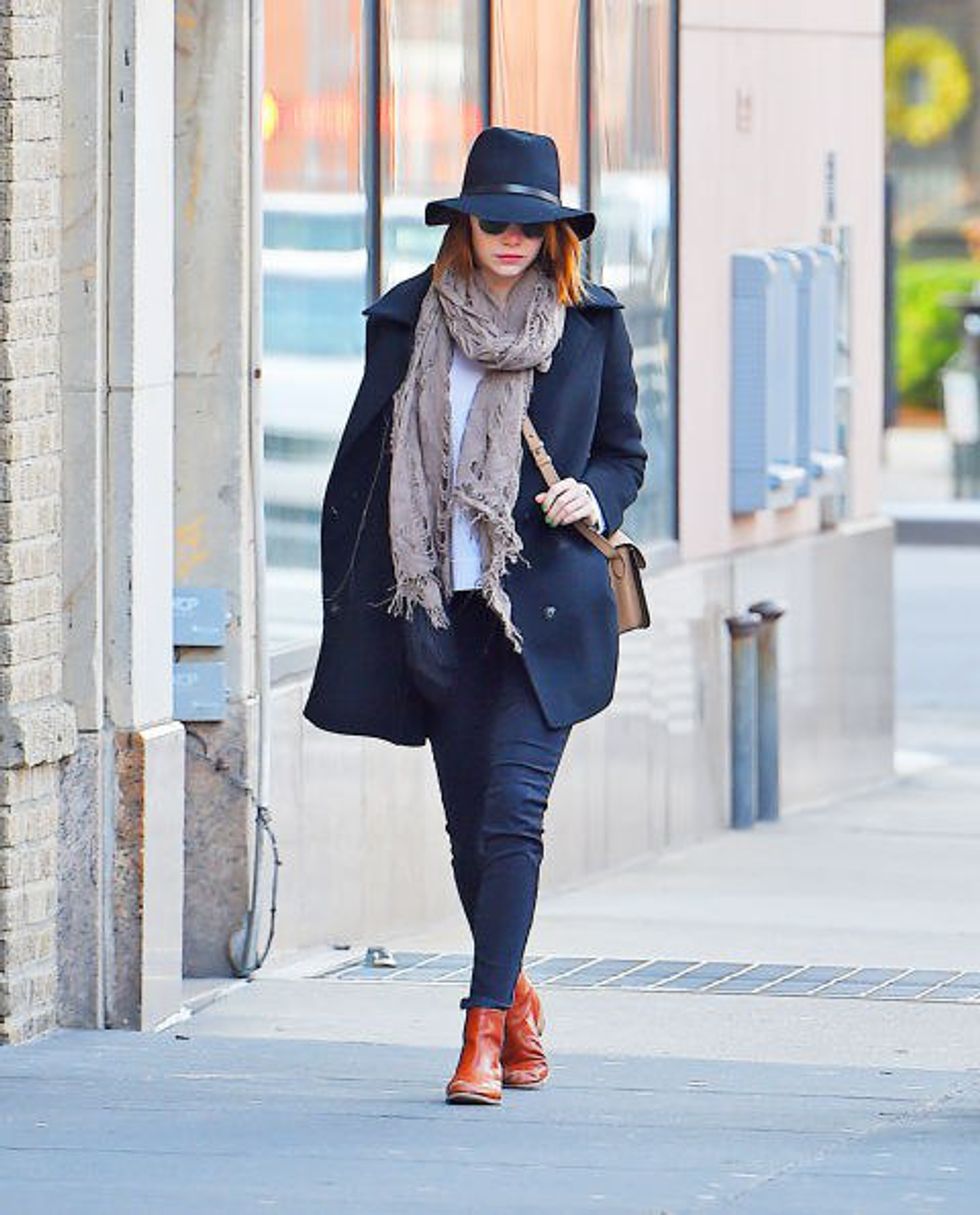 Emma Stone looks amazing in the navy petticoat, hat, and jeans with accent colors in her scarf, boots, and her bag. #goals