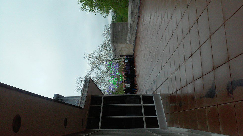 After the ceremony, people gathered on the terrace outside of Alumni Hall as mourners released purple and lime green balloons into the air.