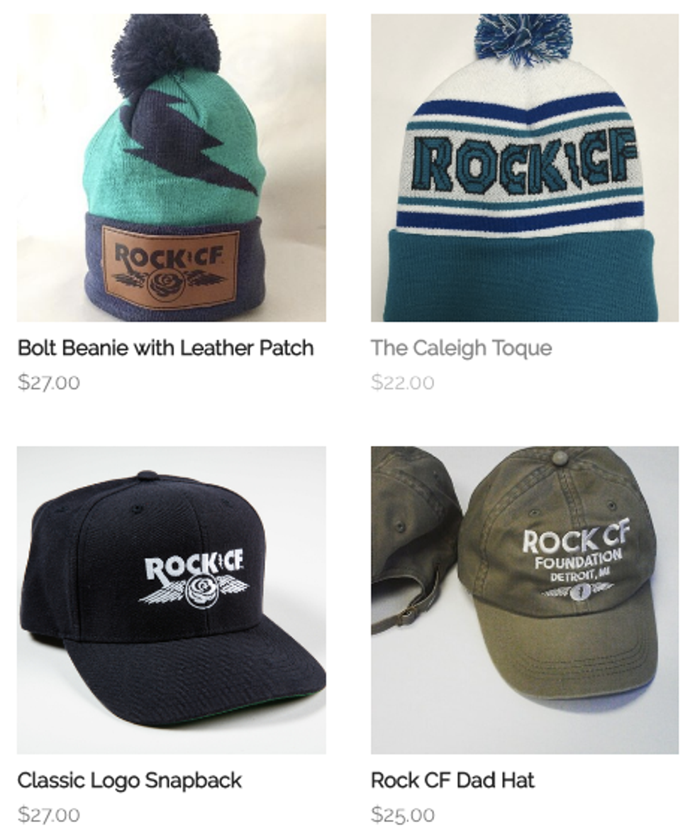 The organization sells a wide variety of “Rock CF” gear, like beanies, snapbacks, and all sorts of athletic t-shirts for both children and adults.