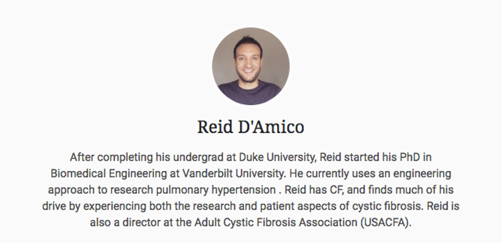 Reid D’Amico is a 24-year-old individual with cystic fibrosis who is currently working towards a PhD in Biomedical Engineering with a focus on rare lung diseases (i.e cystic fibrosis!)