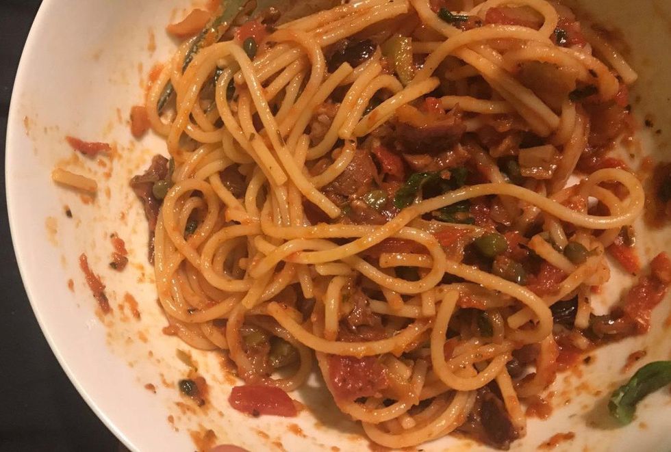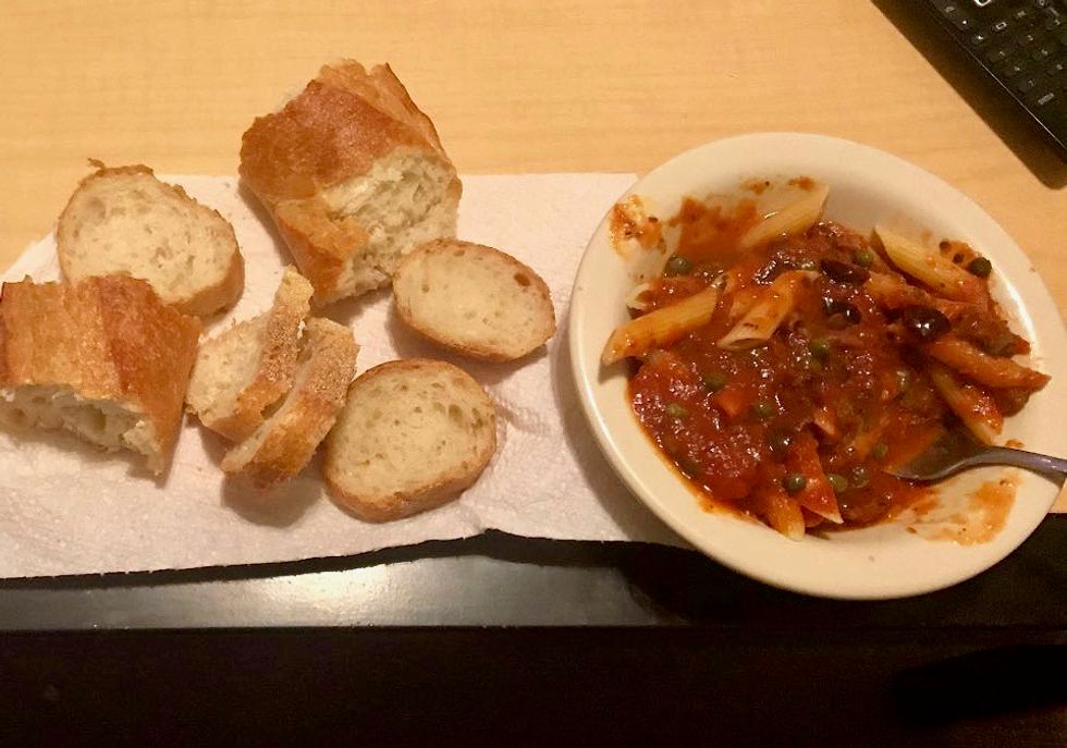 A variation of a recipe I’ve been making for years, my penne puttanesca has gotten me through many carb cravings. I coarsely chop basil, onion, Kalamata olives, and garlic and add the mixture to a plain tomato sauce base. I then add lots of olive oil, salt, oregano, and pepper flakes. Later I add capers (as a replacement for the traditional anchovies) to the sauce. I usually use penne, but I have found angel hair to be faster and just as delicious. I, of course, eat my carbs with more carbs, pairing French or olive bread with the dish. For dessert I recommend the Talenti brand raspberry sorbet, and vegan dark chocolate from Trader Joes.
