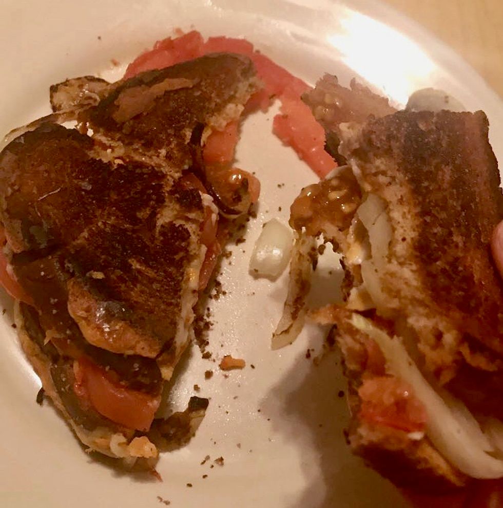 to the toast, and top it with the tomatoes and grilled onions. From there I add