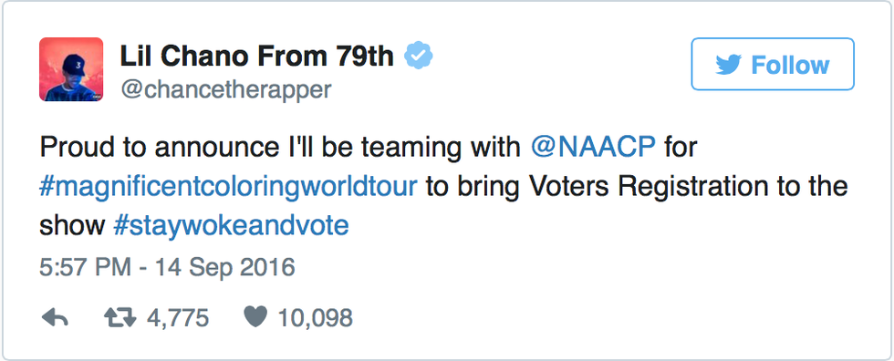 Just one day before his Magnificent Coloring World Tour, Chance The Rapper announced on Sept. 14 he is teaming up with the NAACP and bringing voter registration to his shows. He made the announcement on Twitter and sealed the deal with #staywokeandvote.