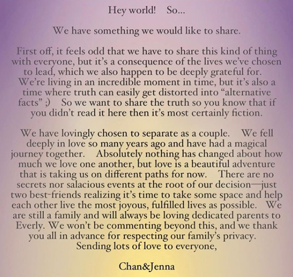 Only four months before the couple announced they were splitting up, Channing posted this picture on Instagram for his wife's birthday. He began his caption by saying, "This creature is one more year beautiful."April 2018: The split