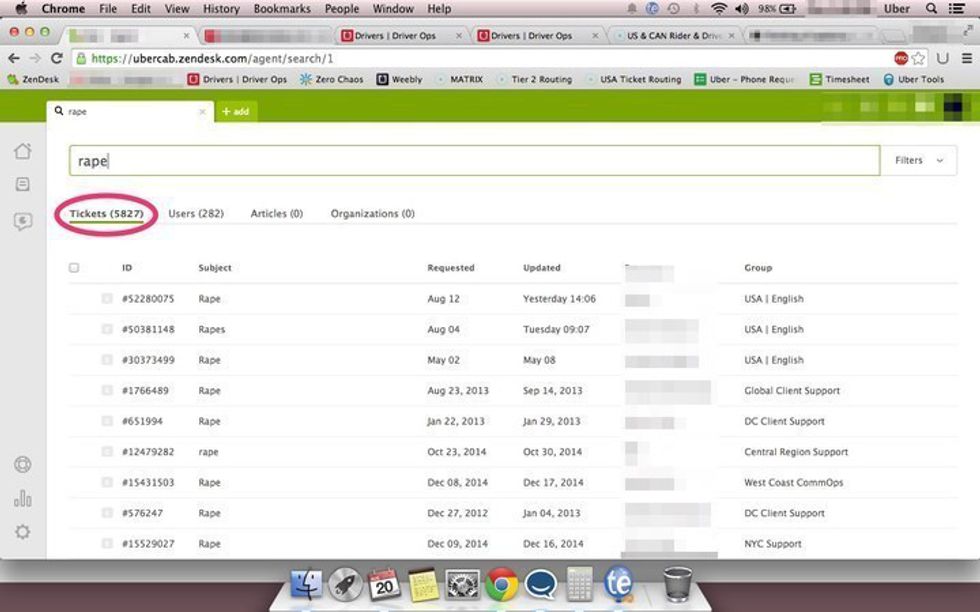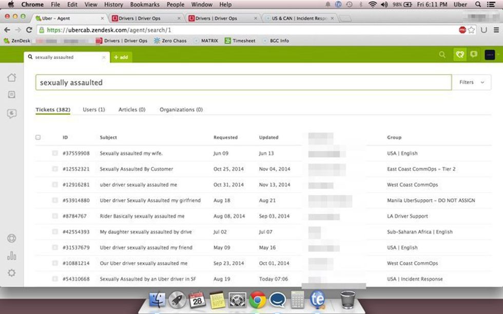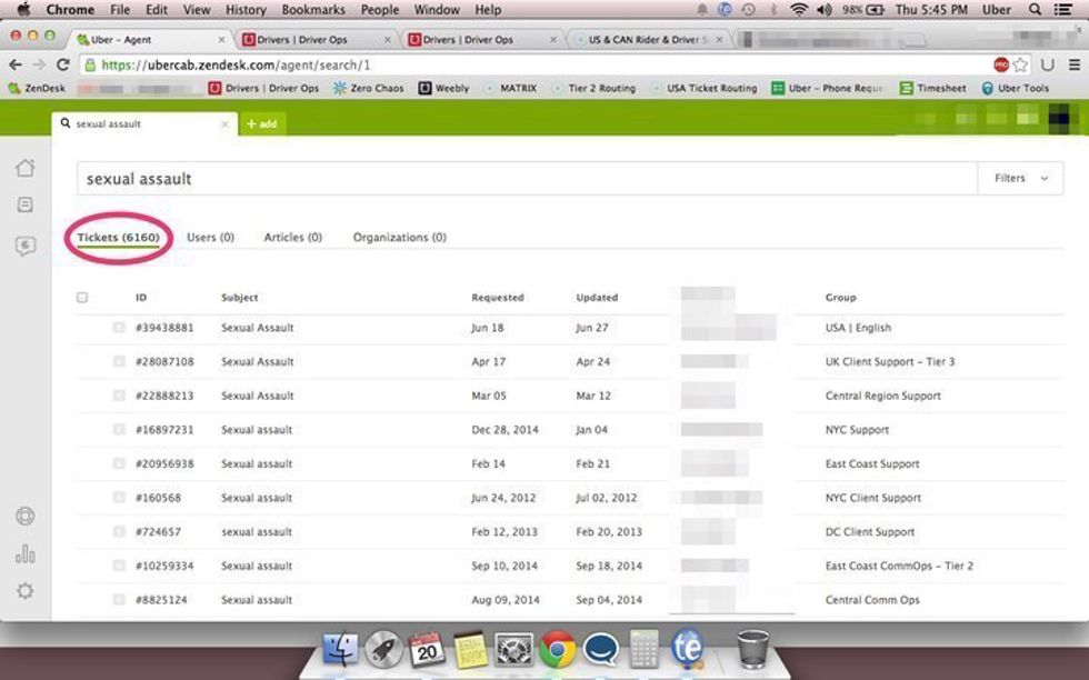 In a recent Buzzfeed article, an Uber customer service representative sent in screenshots of the company's customer service ticket database. When "sexual assault" was searched, 6,160 tickets appeared. For "rape," 5,827 individual tickets came up. For "assaulted," 3,524, and for "sexually assaulted," 382.