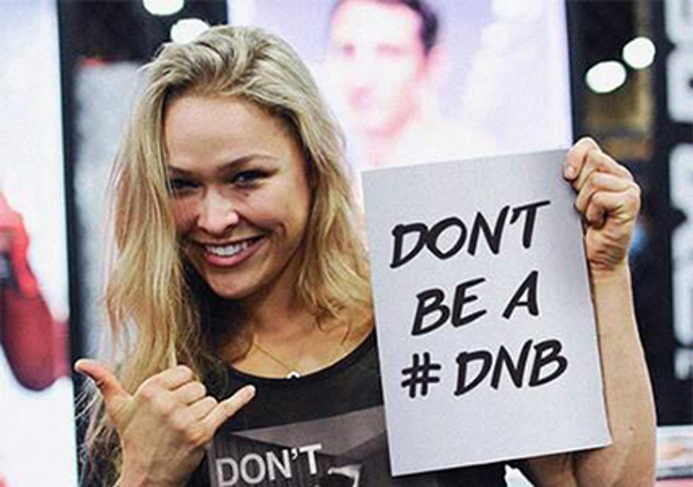 I believe that you should work hard for things you want. And I also believe that you should work towards something that betters the people around you, or the people that aren't around you. That is what not being a DNB actually embraces: finding something you're passionate about, finding something you can do to help others, and doing something about it. Whether or not you like her DNB slogan, you can't deny she lives up to what she stands for. As a UFC champion and now starting a campaign for women struggling with their body images, Ronda Rousey is definitely not a DNB.