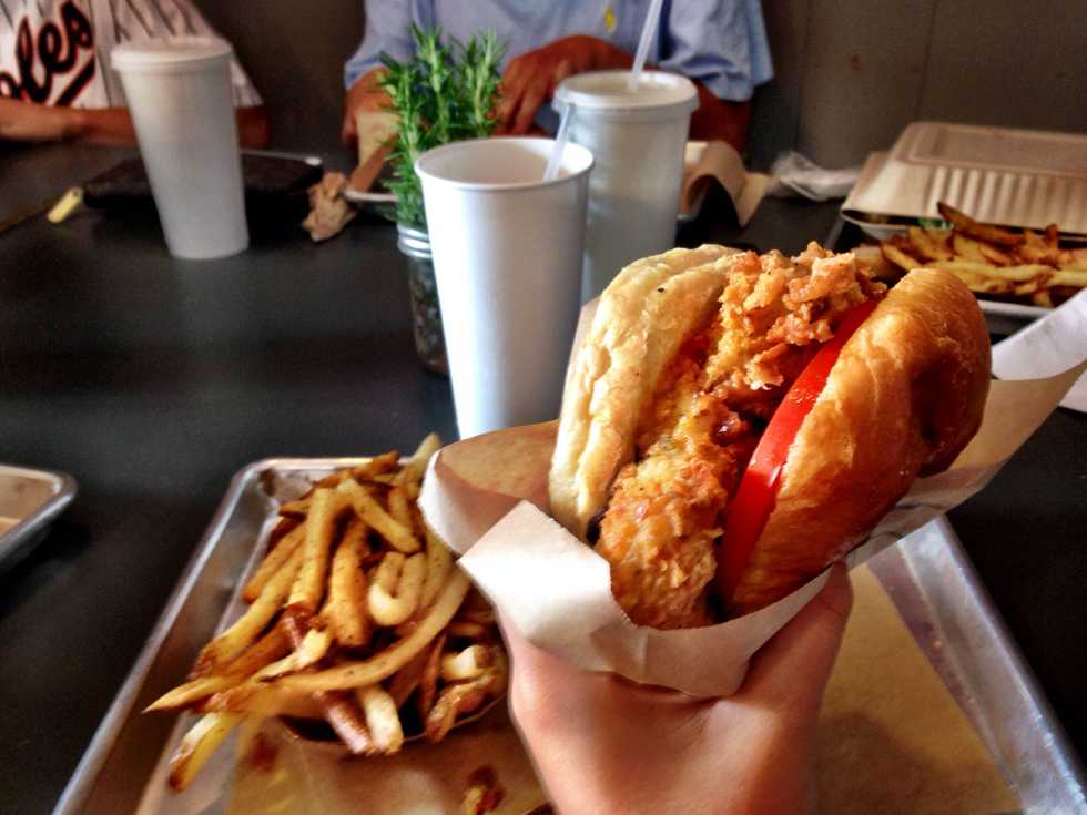 I had the pleasure of eating the Chicken and "Not So Waffle" sandwich with a side of french fries and fried green tomatoes (I had to go a bit nuts, it was my first time there after all). I highly recommend it to everyone that goes to eat at Boxcar Betty's. Prepare to be completely satisfied, yet still craving more of their delicious fried chicken sandwiches.