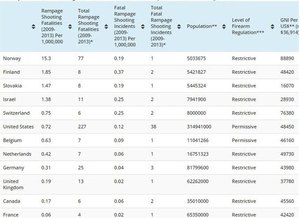 It shows that out of 12 advanced nations, the United States is 6th in rampage shooting fatalities and fatal rampage shooting incidents per one million people. So while the United States had the most incidents from 2009-2013, it only had the 6th most per one million people. Also note how out of the 12 countries, all but the United States and Belgium have restrictive gun policies.
