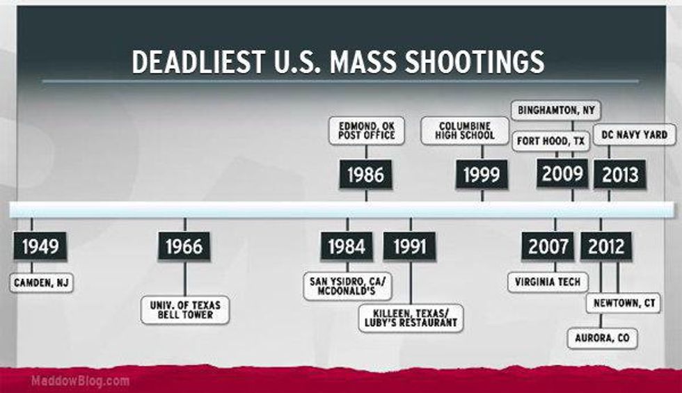 This graph, taken from a 2013 MSNBC article, shows that six of the deadliest shootings in U.S. history happened in the last six years. Since 1949, 28% of the deadliest shootings have been in the last five years, and 92% have happened since 1980. Meanwhile, gun control in America has gotten more strict. Is that the cause? Maybe. Or is it more likely that America's increased love for violent movies and video games- which took off in the 80's and 90's- might have something to do with it?