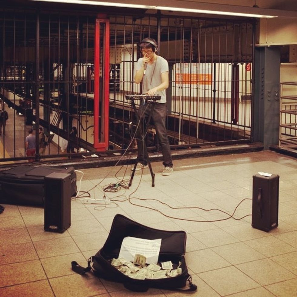In Union Square's subway station, he started to assemble his equipment. Once he finished, he began to recreate popular songs, such as Daft Punk's "Touch it"— dynamically dovetailing the song's electronic instrumental and foregrounded voice—using only his mouth.
