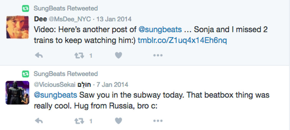 One day when he received a break from his routine occupational responsibilities, Sung found himself watching YouTube clips of up-and-coming beatboxers. These clips presented a very personal yet justifiable question in his heart—"why can't that be me?"— as if his journey rounded out full-circle from the very day, a decade ago, when he watched his first beatboxing video. After watching that first beatboxing video, pursuing beatboxing seriously even when many friends doubted him, beatboxing throughout high school and college, working a traditional 9-5 job and watching these beatboxing clips again, he told me, "it all sort of clicked."