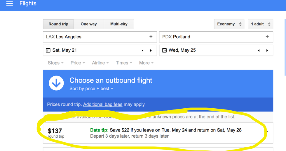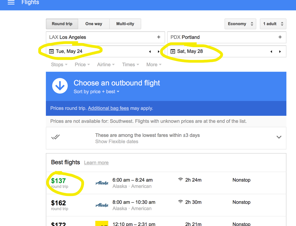 3. Okay, let's say you want to visit Portland, Oregon. Go ahead and plug in the destination and date, and voila! It should now show you the cheapest flights! Tip: Make sure to play around with the dates because sometimes a little pop up shows up and suggest different dates that can lead up to you having a longer vacation or for a better price!