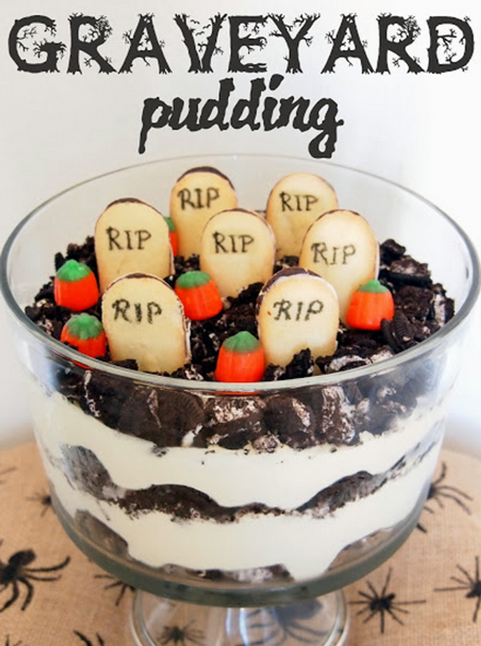 VanessaShafferDesigns makes graveyards look delicious. This recipe is perfect if you want to bring something in a fancier dish. This is also a perfect dessert to put as a centerpiece if you are hosting your own Halloween party. If you’re only planning on having a few people over, she tells you how to make the dessert in individual sized mason jars. Most of us at some point have had Oreo “dirt” pudding and that’s exactly what this recipe is by turning up the notch on decoration.