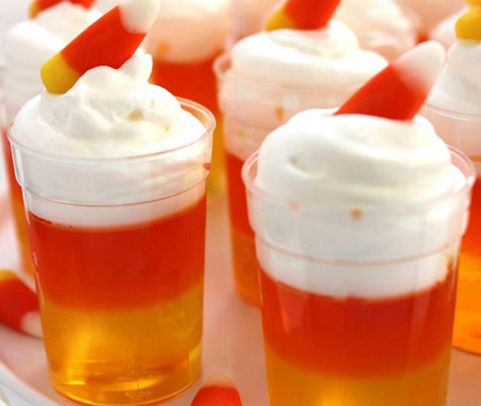 CincyShopper has a children friendly version of jello shots. She took a spin on them by making them candy corn flavored and by omitting the alcohol (though, if you are of age, vodka could be added into the mix). For all-age shots, you need is cool whip, jello and candy corn.