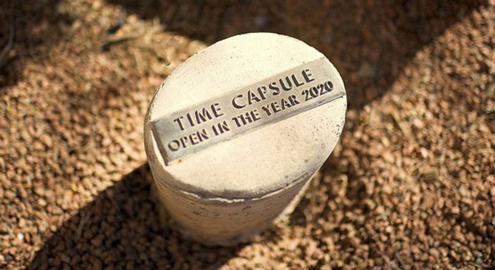 Gather some friends and family and pool together your favorite items and memories. Write yourselves letters. Write down gas prices, milk prices, and everything else you can look back on and say, "kids, in my day this only cost this much." Bury that sucker in the ground and put a time stamp on it.