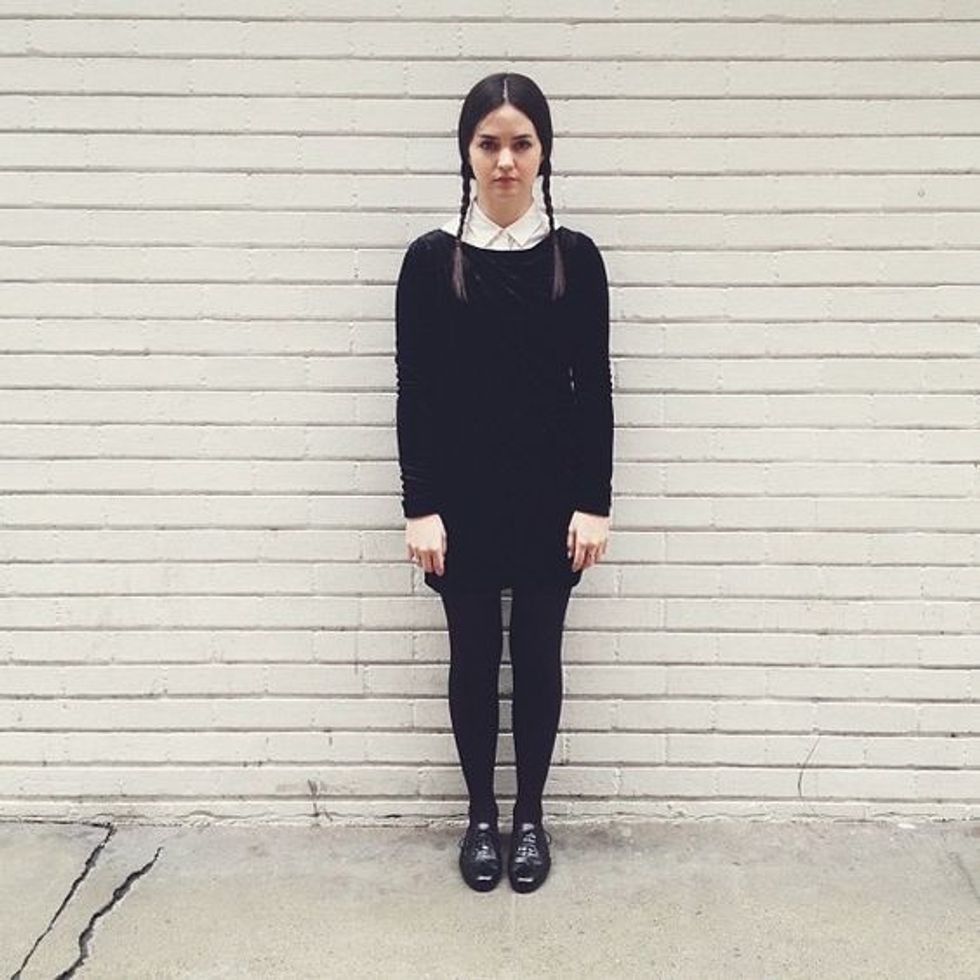 All you need for this costume is a black dress, black shoes, dark makeup and two braids. Bonus points if you have a white collared shirt to layer under and black leggings/pantyhose with white socks layered on top.