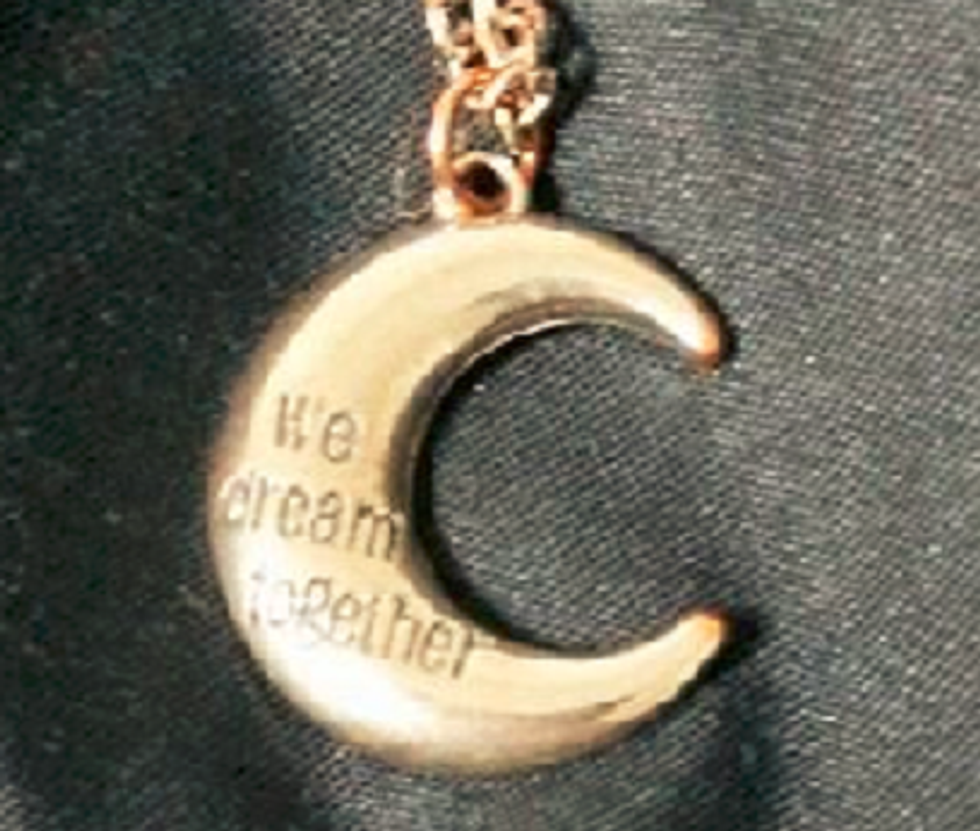 Once a flimsy fake silver, the necklace's chain has worn down to a bronze-ish color, still speckled with some silver. The pendant- a crescent moon inscribed with the honestly silly words "we dream together" — hooks perfectly around my little finger, and I often play with it when I'm nervous.