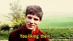 This isn't just a Merthur thing, but a Brolin thing. In this gif, Bradley James (Arthur Pendragon) points out that Colin's (Merlin) cheekbones are (and I quote) "kicking right off on this shot, mate." To this, Colin smoothly comes back with, " Are they? You liking them?" Typical seduction tactic using cheekbones.