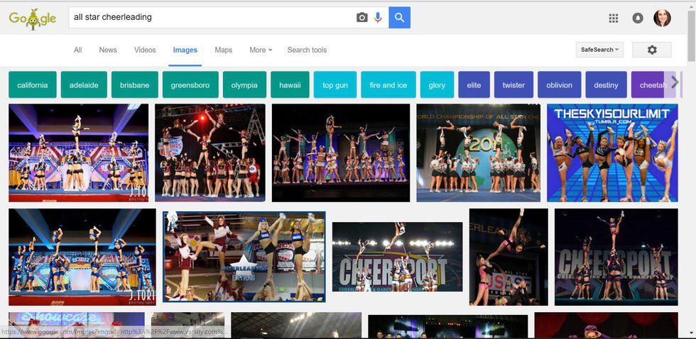 About 90% of the pictures on the first page of this search display cheerleaders from professional sports teams. In reality, the cheerleaders who accompany the Detroit Lions or Dallas Cowboys are more of a dance team than anything. If you want results displaying competitive cheerleaders who fight for world titles, and train for over 30 hours a week, try searching "all star cheerleading." This is the kind of sport that I am accustomed to, and that I wish more people saw and understood. This is what you will see when you refine your search: