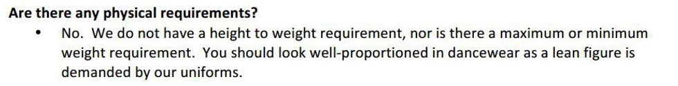 Reading further into the frequently asked questions regarding the program, I found a section labeled "Are there any physical requirements?" The heading alone made me nervous. The first bullet point was all I needed to see. They state that they do not have physical requirements, but go on to suggest recommended expectations. Taken directly from the sheet, the organization states "You should look well-proportioned in dancewear as a lean figure is demanded by our uniforms." Sure, they aren't explicitly telling us that to be accepted onto the team you have to be skinny, but they are choosing their words carefully to insinuate exactly that. If they didn't want there to be a requirement, then they would not have felt obligated to word it in that way. By doing this, it becomes an unspoken rule at the very least. Following is a screen clipping from the requirements page.